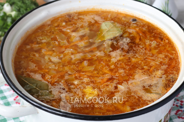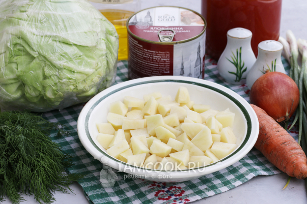 Для приготовления щей из свежей капусты с говяжьей тушенкой подготовить из списка необходимые ингредиенты.