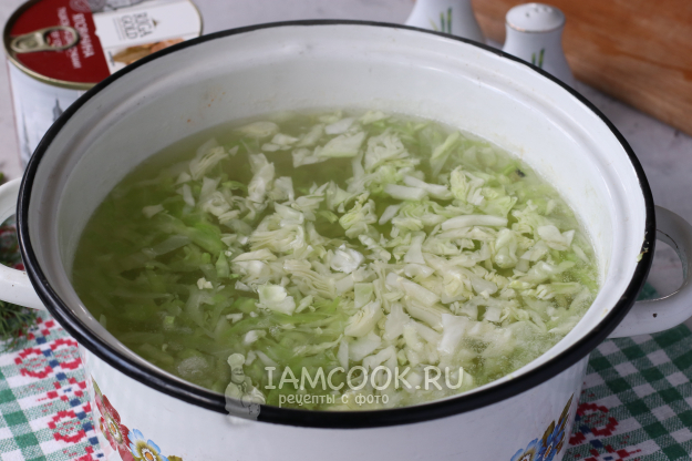 В кипящую воду опустить картофель и снова довести до кипения. Добавить в кастрюлю капусту и варить до готовности.