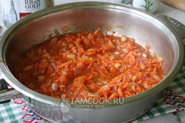В кастрюлю налить воду, поставить на огонь и довести до кипения. Пока вода закипит, приготовить в сковороде зажарку. В сковороду налить 2-3 столовых ложки постного масла, добавить лук с морковью и обжарить до мягкости, добавить томатный сок. Кипятить зажарку вместе с соком пару минут. Вместо сока можно использовать свежие помидоры или разбавленную водой томатную пасту.