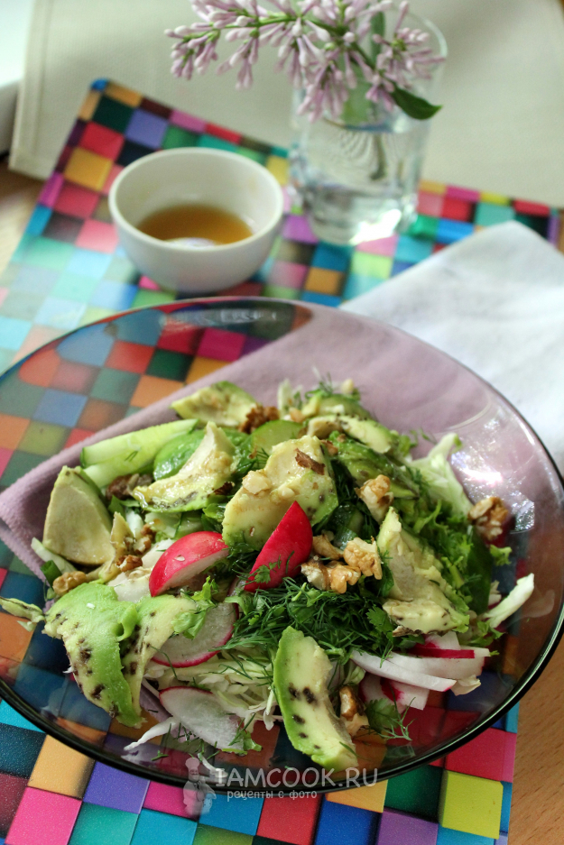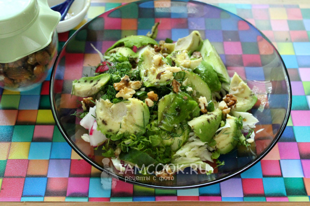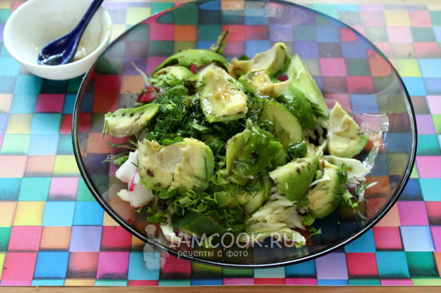 Осталось полить салат с авокадо и капустой этой вкусной заправкой, что мы и делаем прямо перед подачей на стол.