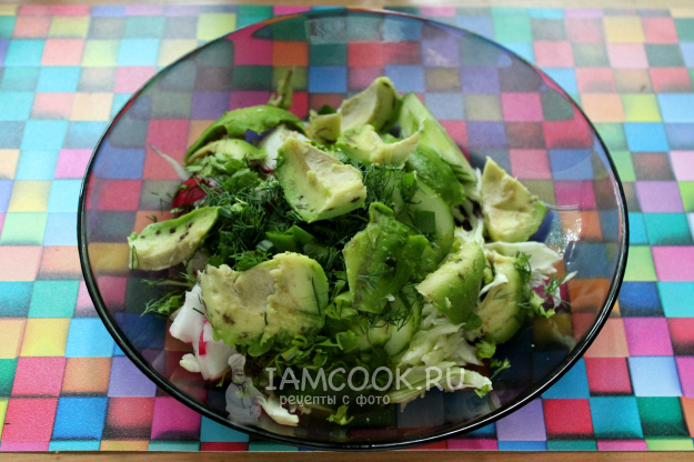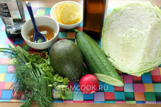 Возьмите продукты для салата с авокадо и капустой и приступаем к его приготовлению.