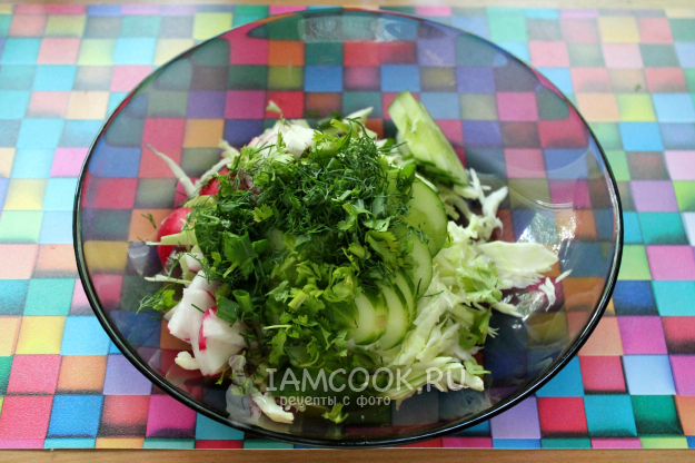 Измельчите листочки кинзы, укропа и перышки зеленого лука. Отправьте их к остальным ингредиентам в салатник.