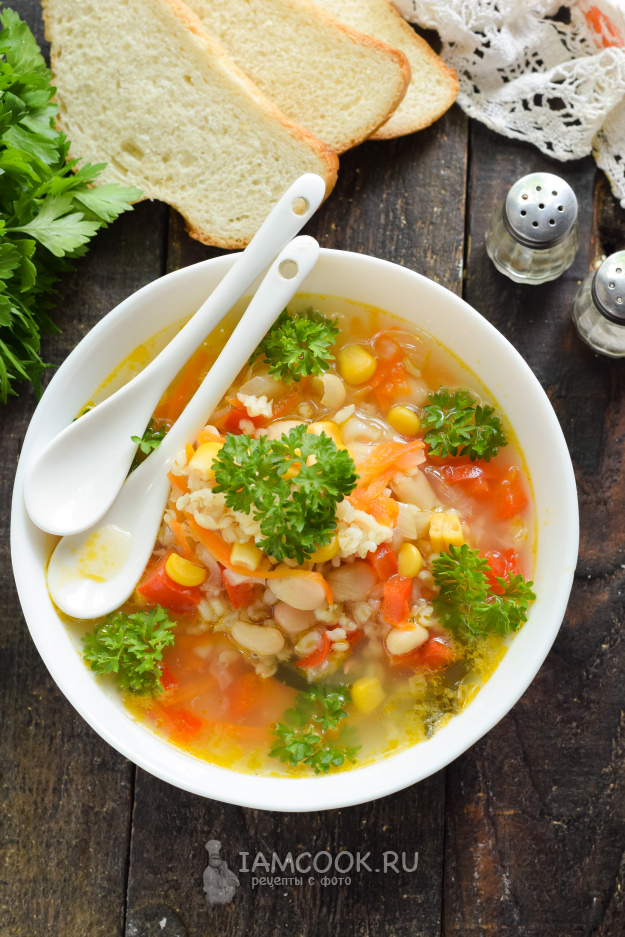 Снять кастрюлю с огня, разлить суп с фасолью и кукурузой по тарелкам и подавать к столу.