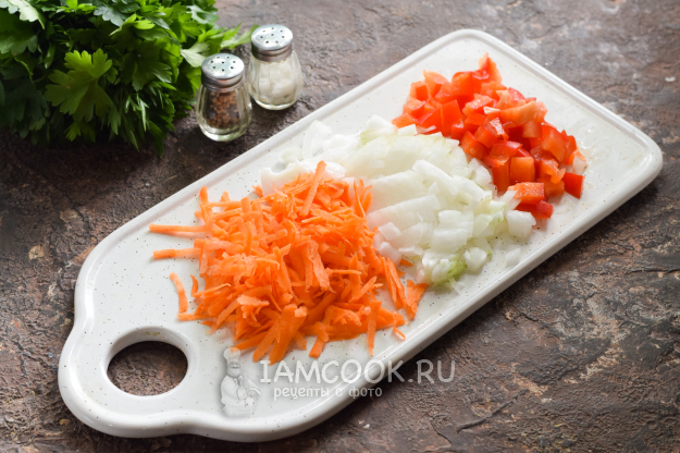 Очистить лук, морковь, сладкий перец. Овощи вымыть и просушить. Нарезать лук и перец небольшими кубиками, морковь необходимо натереть на средней терке.