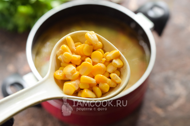 Теперь добавить в суп консервированную кукурузу, варить еще 5 минут.