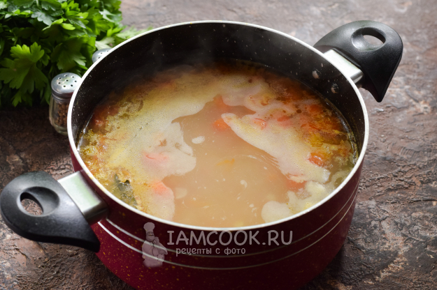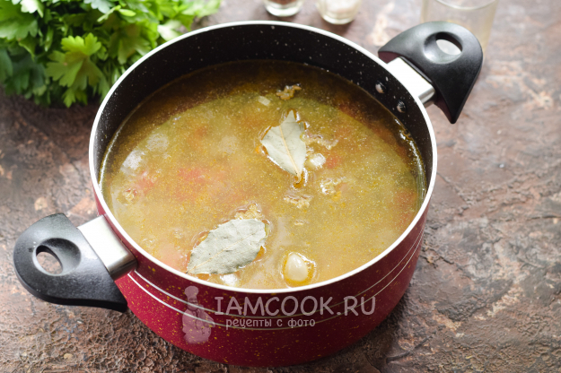Вскипятить чайник с чистой водой. Залить овощи и крупу горячей водой, добавить лавровый лист, соль и перец по вкусу. Варить суп 20-25 минут.