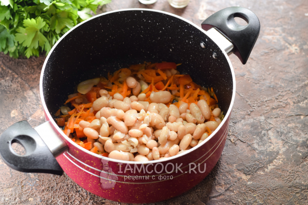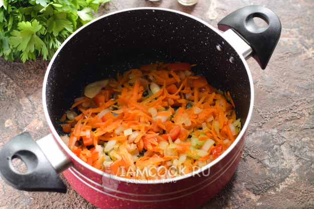 В кастрюле с толстым дном разогреть растительное масло, выложить морковь, лук и перец - жарить овощи на среднем огне, помешивая, 3-4 минуты.