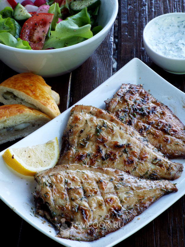 В момент жарки можно смазать рыбу оставшимся маринадом.