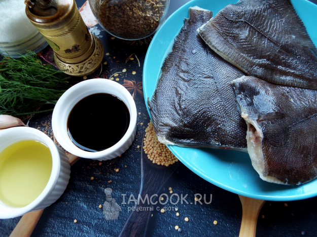Возьмем ингредиенты, необходимые для запекания замаринованной камбалы на мангале на решетке.