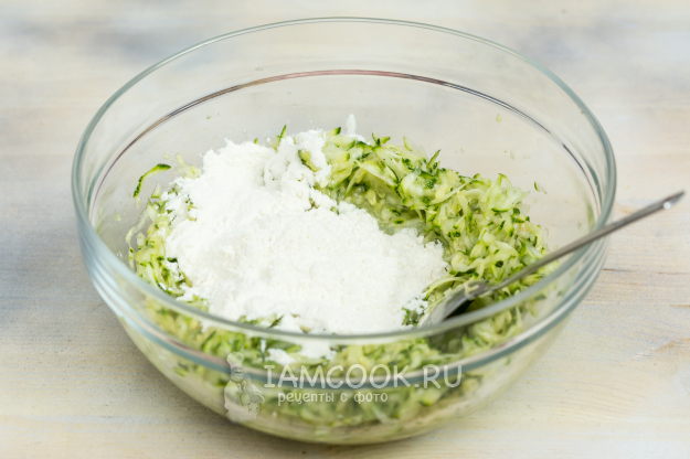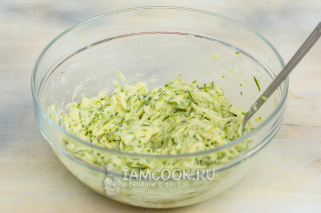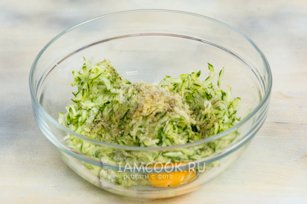 Выложите в миску натертый кабачок. Добавьте соль и перец, яйцо.