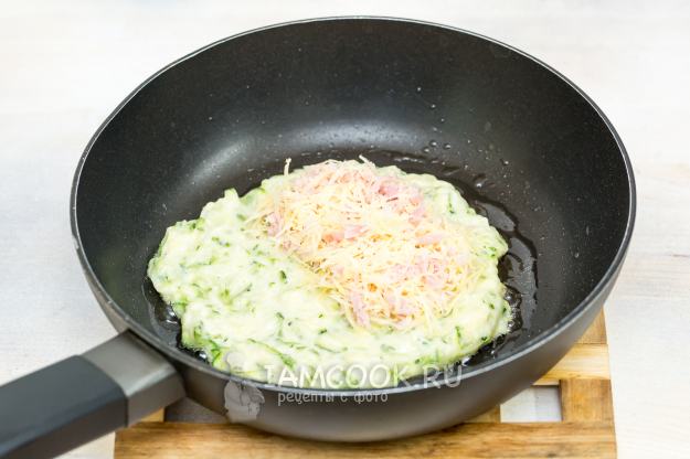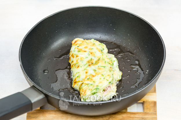 Выложите 2-3 ст.л. кабачкового "теста", разровняйте в круг. Когда низ немного схватится, на половину блинчика выложите начинку, слегка утрамбуйте.