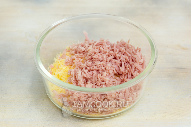 Сыр натрите на мелкой терке, ветчину - на крупной.