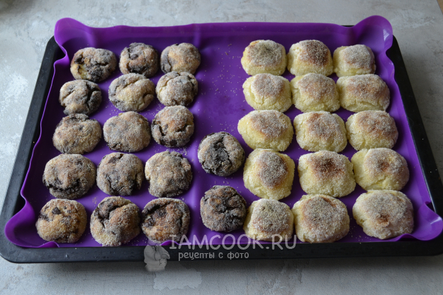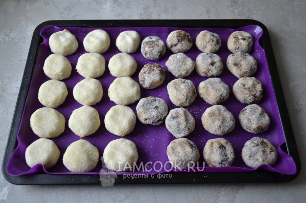 Положите шарики на противень, застеленный пекарской бумагой или силиконовым ковриком. Каждый шарик немного прижмите сверху, и поставьте противень в заранее разогретую до 180°С духовку на средний уровень. Режим выпечки - верх-низ.