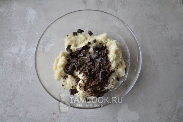 Во вторую часть теста положите поломанный на кусочки шоколад и тоже перемешайте.