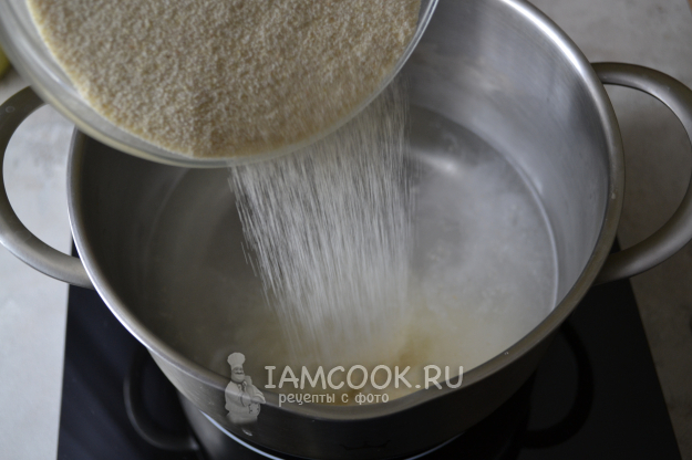 Влейте холодную воду в кастрюлю, поставьте ее на огонь и всыпьте манную крупу, сразу же хорошо размешайте, чтобы не образовались комочки.
