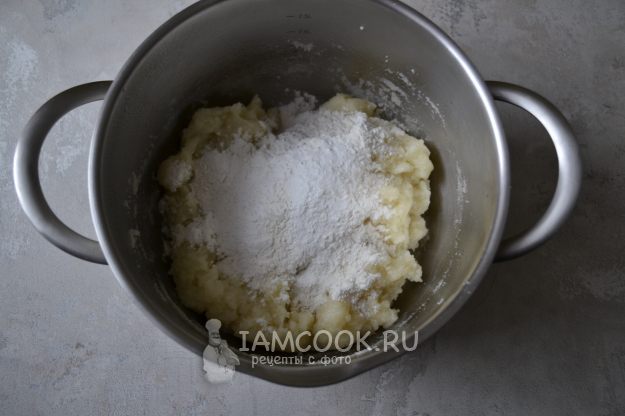 Перемешайте кашу с мукой до однородной консистенции. Половину манного теста переложите в другую посуду.
