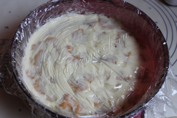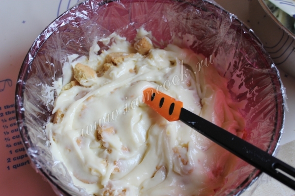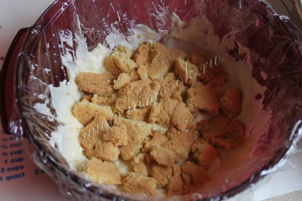Делаем так до тех пор, пока не кончится крем и кусочки. Сверху нужно смазать кремом. Закрываем все пленкой и кладем небольшое блюдо. Убираем на ночь в холодильник.