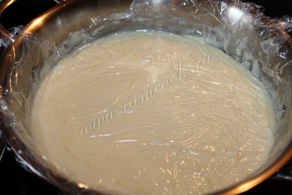 Закрываем кастрюльку с кремом пленкой таким образом и убираем на холод.
