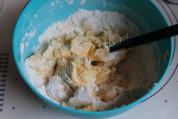 Мягкий маргарин разотрем с сахаром, добавляем желтки и соду гашенную. Постепенно добавляем муку и замешиваем тесто.