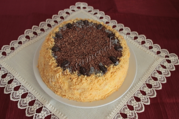 Утром переворачиваем торт на блюдо, снимаем пленку. Украшаем. У меня остались кусочки и я раскрошила их для боков. Верх украсила тертым шоколадом.