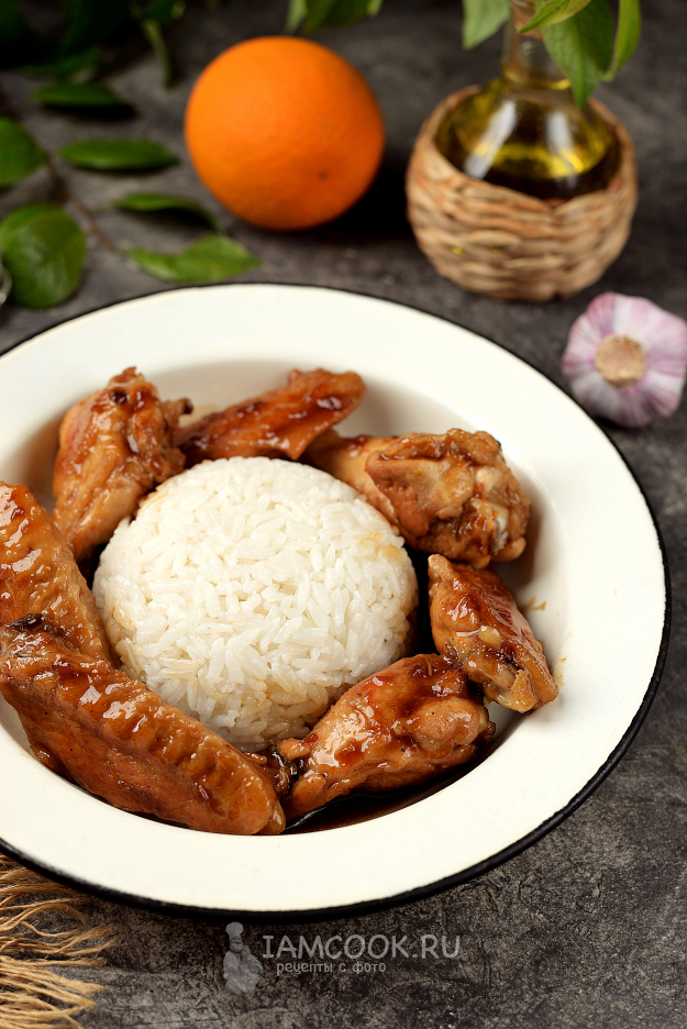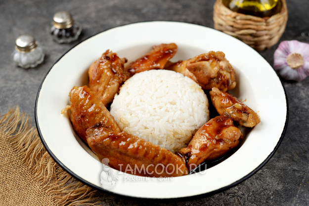 Подавать такие крылышки вкуснее всего с вареным рисом. Я выложила его в центр глубокой тарелки с помощью пиалочки, вокруг риса выложила крылышки и полила их соусом.