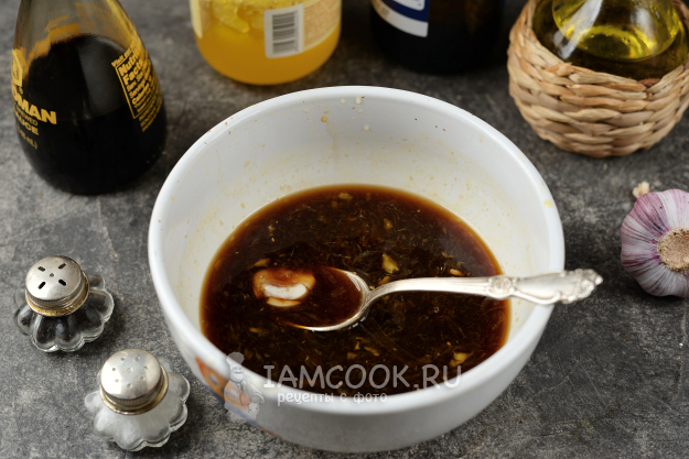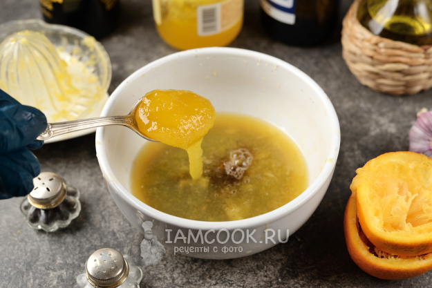 А пока разрежьте крупный апельсин пополам, выдавите сок в удобную мисочку, добавьте соевый соус, винный или любой другой 6% уксус, положите по вкусу мед.