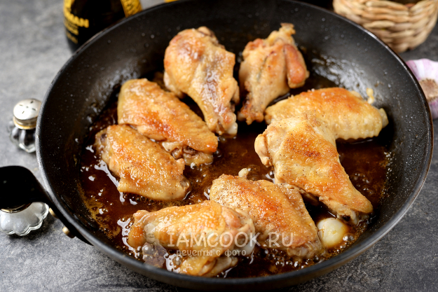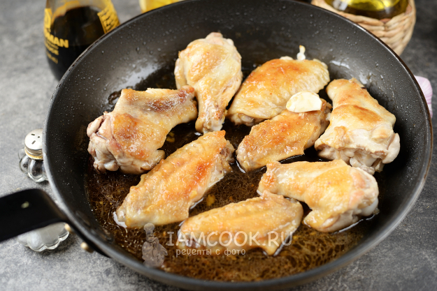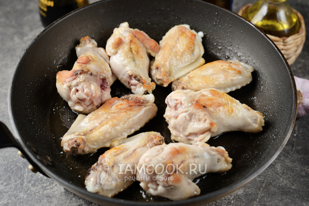 Разогрейте в сковороде немного растительного масла, выложите в него разрезанные по локтевому суставу крылышки. Жарьте их на тихом огне до полной готовности, пока из косточек не перестанет выделяться кровь, а мясо не начнет слегка отделяться от кости. Советую накрыть сковороду крышкой, чтобы жир не стрелял.