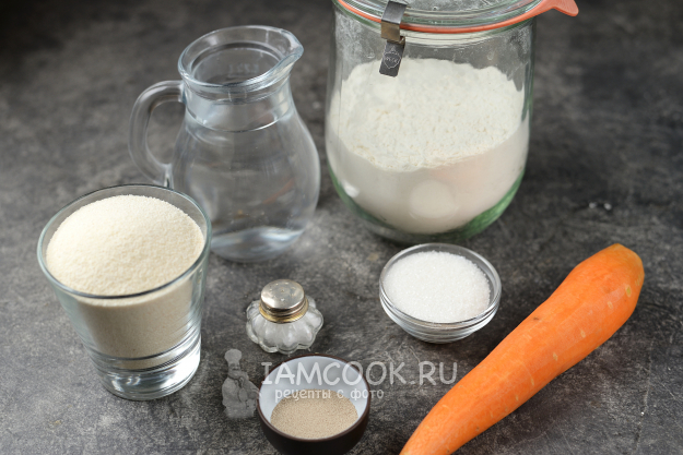 Возьмите все необходимые продукты для постных морковных оладий с манкой и мукой. Морковь очистите от кожуры, помойте и обсушите.