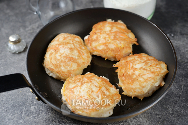 Разогрейте сковороду, влейте немного растительного масла, выкладывайте в него по полной столовой ложке с горкой теста и выпекайте на умеренном огне минуты по 3 с каждой стороны. Не лейте масла много, поскольку оно моментально впитывается блинчиками.