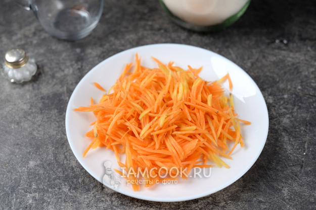 А пока натрите морковку на специальной терке тоненькой соломкой.