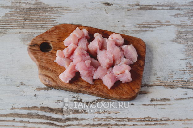 Филе индейки помойте под проточной водой, обсушите кухонным бумажным полотенцем и нарежьте кубиками, размером с половину спичечного коробка.