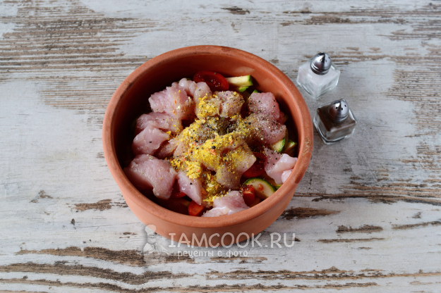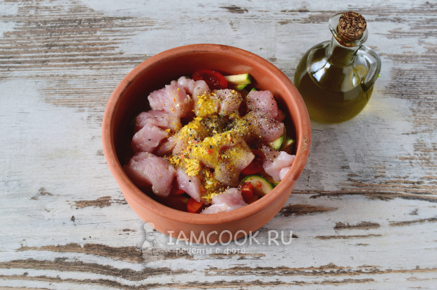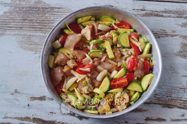 Дальше все просто: в миске перемешать все ингредиенты блюда, добавить приправу для птицы, соль и перец.