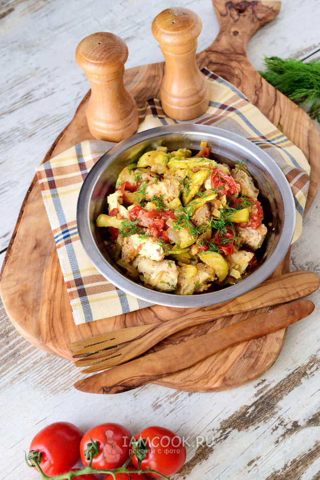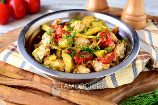 Подавать индейку с кабачком и помидорами будем порционно, посыпав зеленью укропа.