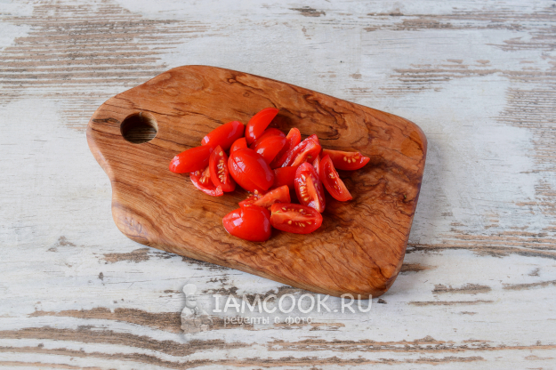 Помидоры черри разрезать пополам. Если у вас большой помидор, нарежьте его мелким кубиком.