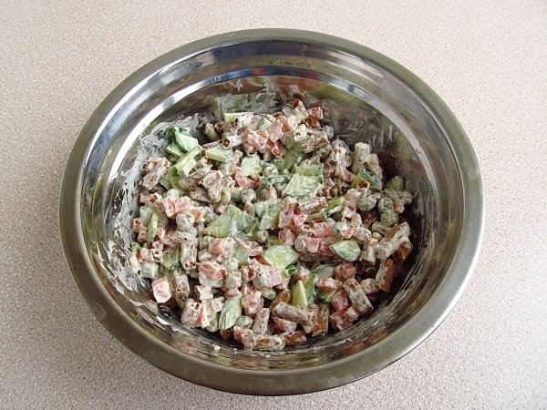 Ингредиенты заправить майонезом и, при необходимости, посолить.