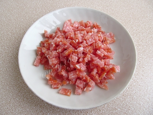 Колбасу очистить от оболочки и нарезать мелкими кубиками.