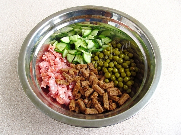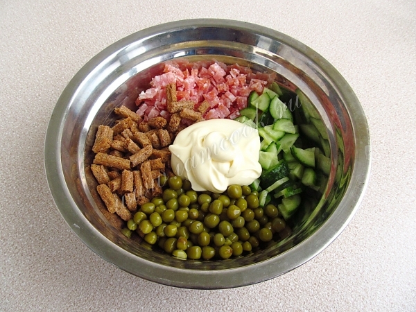 Соединить колбасу, сухарики, горошек и огурец.