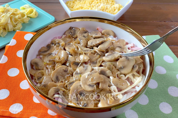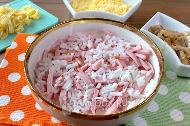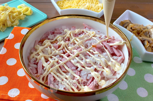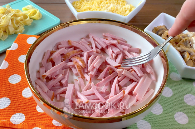 Нарежьте ветчину соломкой и выложите в салатник первым слоем.