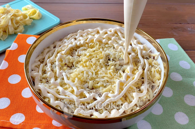 Далее посыпьте тертым сыром и смажьте майонезом.