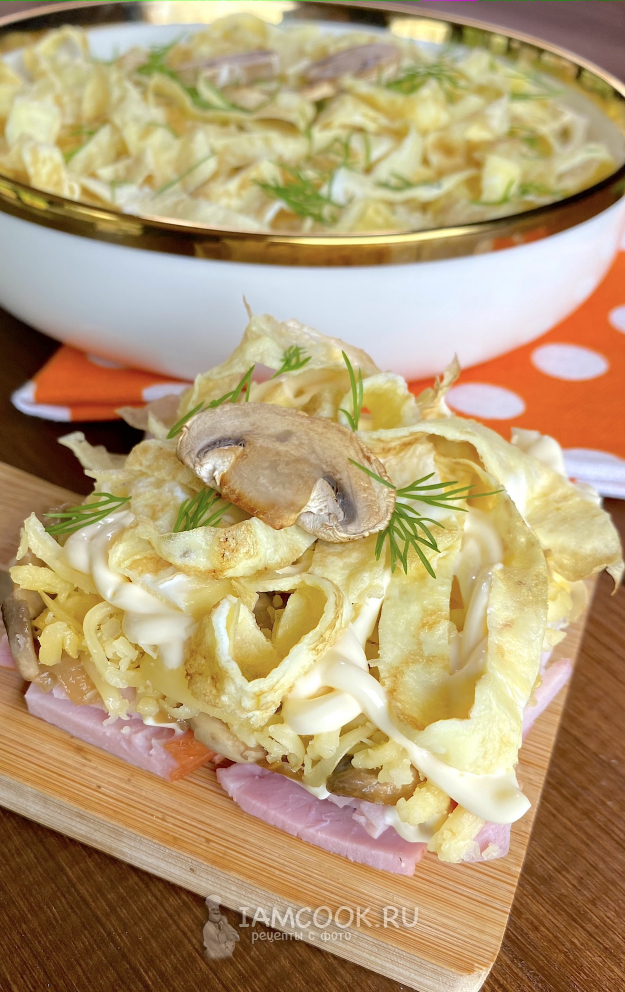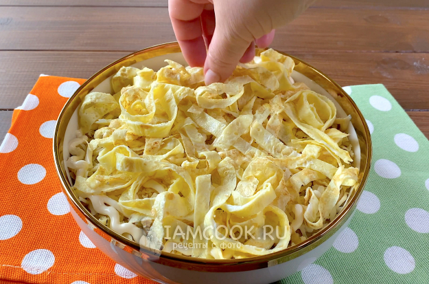 Салат «Девчата» с яичными блинчиками готов. Приятного аппетита!
