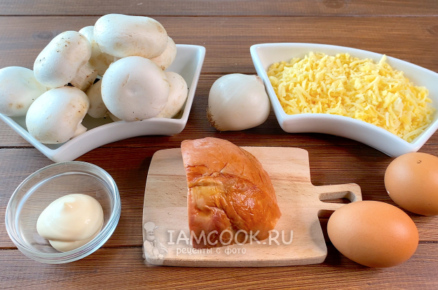 Для начала подготовьте все необходимые продукты для салата «Девчата» с яичными блинчиками.