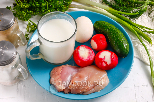 Подготовьте необходимые ингредиенты для создания ПП-окрошки на кефире с курицей (куриным филе). Мясо отварите в течение 15-20 минут в горячей воде, добавив пару щепоток соли и лавровые листья. Затем переместите в ледяную воду для охлаждения.