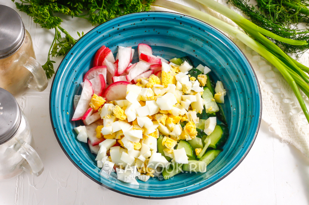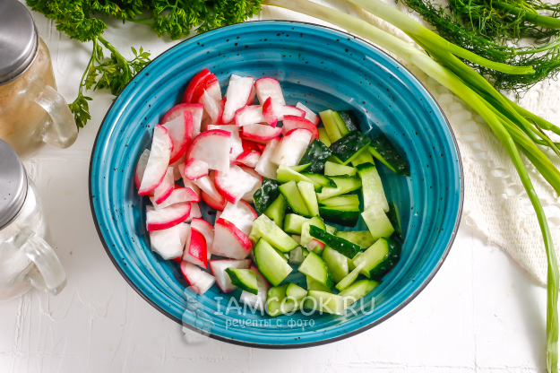 Промойте редис и огурец, срежьте хвостики с овощей и нарежьте их брусочками. Выложите нарезки в глубокую емкость.