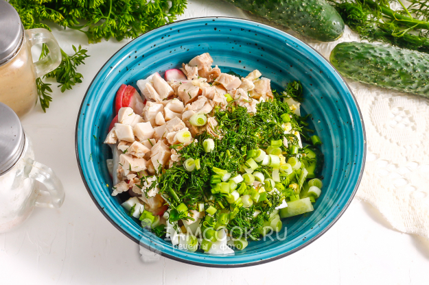 Нарежьте охлажденное куриное филе мелкими кубиками. Промойте свежую зелень и измельчите, добавьте к остальным ингредиентам вместе с нарезкой мяса. Можно дополнить блюдо измельченной петрушкой или шпинатом.