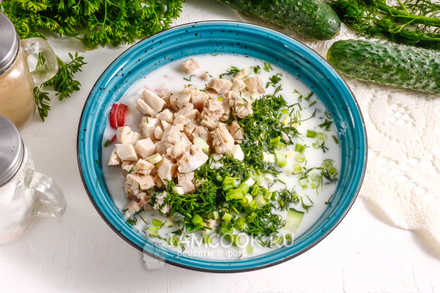 Посолите нарезки и влейте охлажденный кефир. Аккуратно все перемешайте. По желанию пп окрошку на кефире с курицей можно поместить в холодильник на 1 час - за это время блюдо пропитается ароматом зелени и станет еще вкуснее.