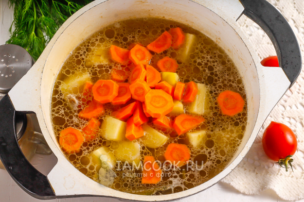 Крупно нарежьте морковь и тоже всыпьте нарезку в кипящий бульон. Добавьте специи и аккуратно перемешайте. Отварите примерно 10-15 минут.