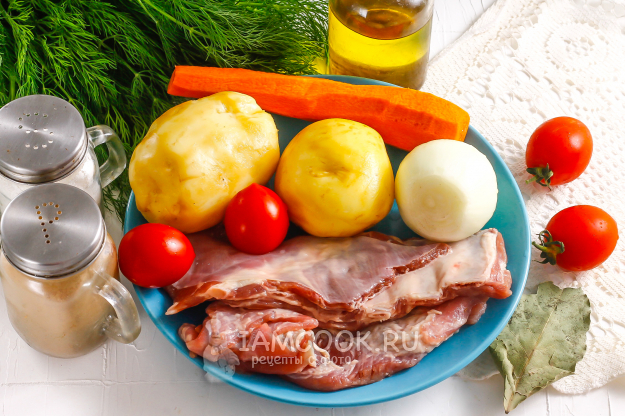 Подготовьте необходимые ингредиенты для создания наваристой шурпы из бараньих ребрышек в казане. Тщательно очистите овощи от кожуры и промойте в воде. Выложите их в емкость с водой, чтобы они не обветрились, пока будет вариться мясо.