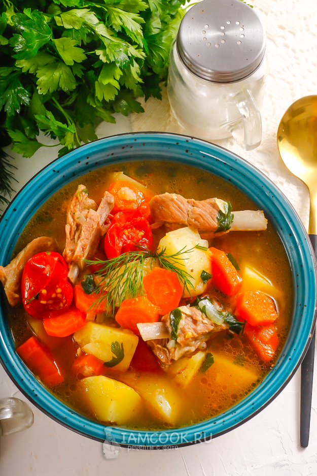 Разлейте шурпу из бараньих ребрышек в глубокие тарелки и подайте к столу непременно горячей! Можно дополнить блюдо сметаной или чесночным майонезом, несладкими хлебобулочными изделиями.