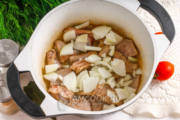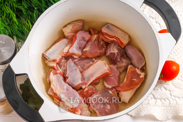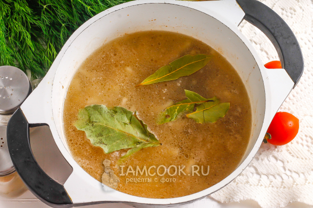 Влейте воду и добавьте лавровые листья. Отварите мясо примерно 40 минут на умеренном нагреве, сняв образовавшуюся пену с помощью шумовки.
