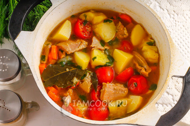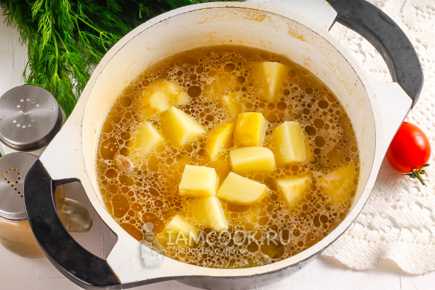 Когда указанное время пройдет, нарежьте крупными кубиками картофель и добавьте в казан. Объем жидкости уменьшится примерно на треть.